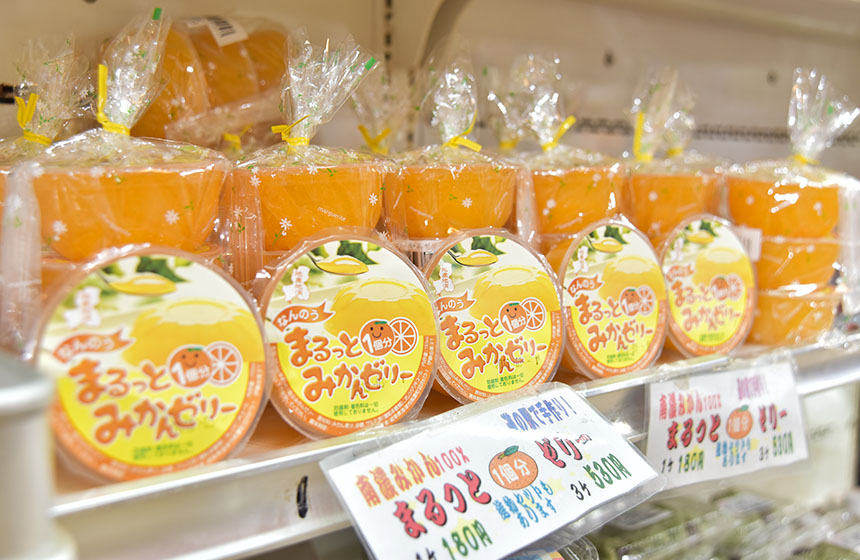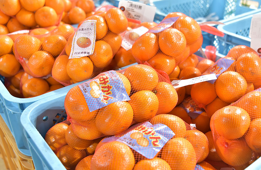 秋はカキ、ミカン、クリなどがならびます。冬は甘みを引き出した蔵出しミカンの最盛期です。